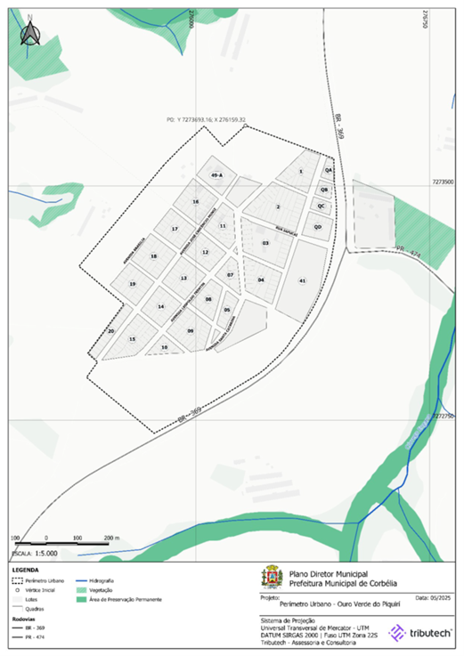 Todas as coordenadas aqui descritas estão georreferenciadas ao Sistema Geodésico Brasileiro e encontram-se representadas no sistema UTM, referenciadas ao Meridiano Central -51, Fuso 22S, tendo como DATUM SIRGAS 2000. Todos os azimutes e distâncias, área e perímetro foram calculados no plano de projeção UTM.